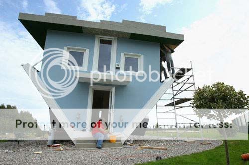 A House that is entirely upside-down opened its doors to the public on the northern German Island of Usedom. The family sized house, designed by polish partners Klausdiusz Golos and Sebastian Mikiciuk for the edutainment exhibition company, is furnished with chairs, tables and carpets stuck to the ceiling.